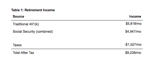 Footnote to table: taxes calculated assuming 2018 income tax code, for a California resident claiming standard deductions, filing jointly, and assuming 85% of Social Security income is taxable. See calculations here.