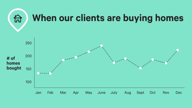 There’s no doubt about it: home buying is seasonal. Looking at Wealthfront client data on number of new mortgages taken out each month, it’s clear that June and late November/early December see the most home buying activity.