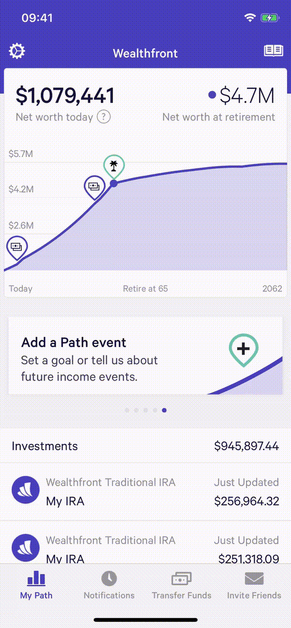 Path is a sophisticated personal finance model offered by Wealthfront that allows Clients to explore projections of various possible financial outcomes based on the latest data from their linked financial accounts, tolerance for risk, and current investments, as well as assumptions compiled by Wealthfront’s Research team. The images in this post are examples to illustrate what Path can do. They don’t include any actual Client plans, goals, or personal financial data.