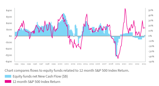 If we look back over time we can see that big market fluctuations result in consistent poor behavior. When prices are high and returns are good, money tends to flow into equity mutual funds; when prices are low, investors typically make net withdrawals of funds. The chart below looks at the flow of money into and out of equity mutual funds (the shaded histograms) on the 12-month returns of the Standard and Poor’s 500 index (the solid line) over the course of two decades.