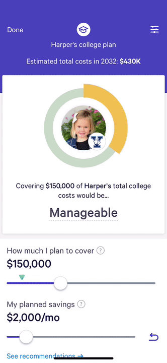 Now all of our clients can see what their alma mater is expected to cost whenever their child is ready to enroll with just a few taps. Maybe you already have a little one in your favorite school’s gear watching the big games with you. You dream of them following in your footsteps, but you need to know how much it’s going to cost, whether it’s 5, 10, or 15 years down the road. Wealthfront helps you explore your options by giving you a complete and total cost estimate based on when they will be ready to attend.