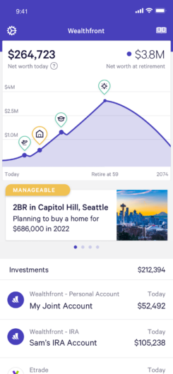 Maybe you both want to buy a home because of the general belief that “renting is throwing money away.” That’s often (but not always!) true. To analyze whether or not it’s smart to buy in your city, you have to weigh a number of factors. Or rather, Wealthfront can help you weigh a number of factors using our home buying planning feature, which basically tells you everything you need to know to make a plan based on your finances. We use current home prices through a Redfin integration to show you what it takes to buy a place in different markets, and if anything changes — your location, your financial circumstances, or the housing market — Wealthfront will automatically update the plan for your home buying goal.