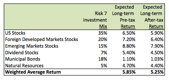 The table below displays our recommended asset allocation for our average client (one with a risk tolerance of 7 on a scale of 0 to 10):