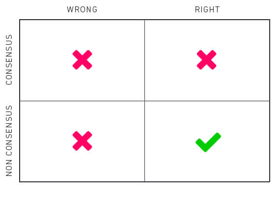 The only way to generate superior returns in venture capital is to take risk. This reminds me of a framework popularized by my investment idol, Howard Marks of Oaktree Capital. He says the investment business can be described with a two-by-two matrix. On one dimension you can either be right or wrong. On the other you can be consensus or non-consensus. Obviously you don’t make money if you are wrong, but most people don’t realize you don’t make money if you are right and consensus because the opportunity is too obvious and all the returns get arbitraged away. The only way to generate outstanding returns is to be right and non-consensus. That’s hard to do because you only know you’re non-consensus when you make the investment. You don’t know if you’re right.