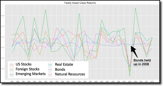 Figure 1: Yearly Asset Class Returns; during the 2008 financial crisis US investment-grade bonds held up well (in blue) while many other segments took a nosedive.
