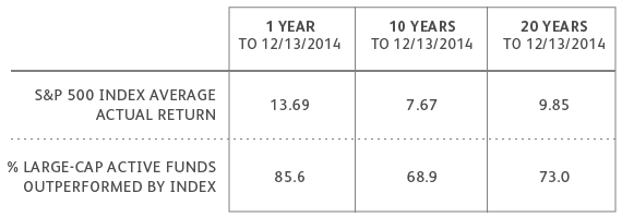 The most frequently voiced critique of indexing is that “it guarantees mediocrity.” “Who wants to be average?” the criticism goes, when investors really strive to be exceptional. In reality, however, index funds produce above-average performance. The index fund provides the overall market return at virtually zero cost. The average fund must underperform  the index fund by the difference in the costs that are charged by active managers. And, in fact, the data confirm that the average investor in an actively-managed mutual fund does underperform the returns of the index fund. Over the 20 years ending December 31, 2014, the S&P 500 index fund returned 9.85% annually. The average actively-managed fund returned 9.06% [1] . The difference was caused by the extra costs associated with active management. Index investing produces superior  results.