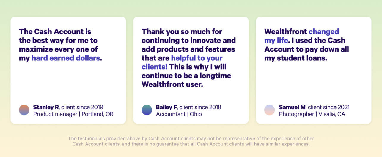 Cash Account is offered by Wealthfront Brokerage LLC (“Wealthfront Brokerage”), a Member of FINRA/SIPC. Neither Wealthfront Brokerage nor any of its affiliates are a bank, and Cash Account is not a checking or savings account. We convey funds to partner banks who accept and maintain deposits, provide the interest rate, and provide FDIC insurance. Investment management and advisory services–which are not FDIC insured–are provided by Wealthfront Advisers LLC (“Wealthfront Advisers”), an SEC-registered investment adviser, and financial planning tools are provided by Wealthfront Software LLC (“Wealthfront”).