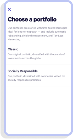 It takes just a few taps to turn your taxable Investment Account or Wealthfront IRA into a Socially Responsible portfolio or start fresh with a new account. Your Socially Responsible portfolio is personalized to your risk level, fully customizable, and uses expert-vetted ETFs that track more socially responsible indices than our Classic portfolio. At the same time, it’s designed to retain risk and return characteristics that are similar to our Classic portfolio so you can stay on track for your financial goals.