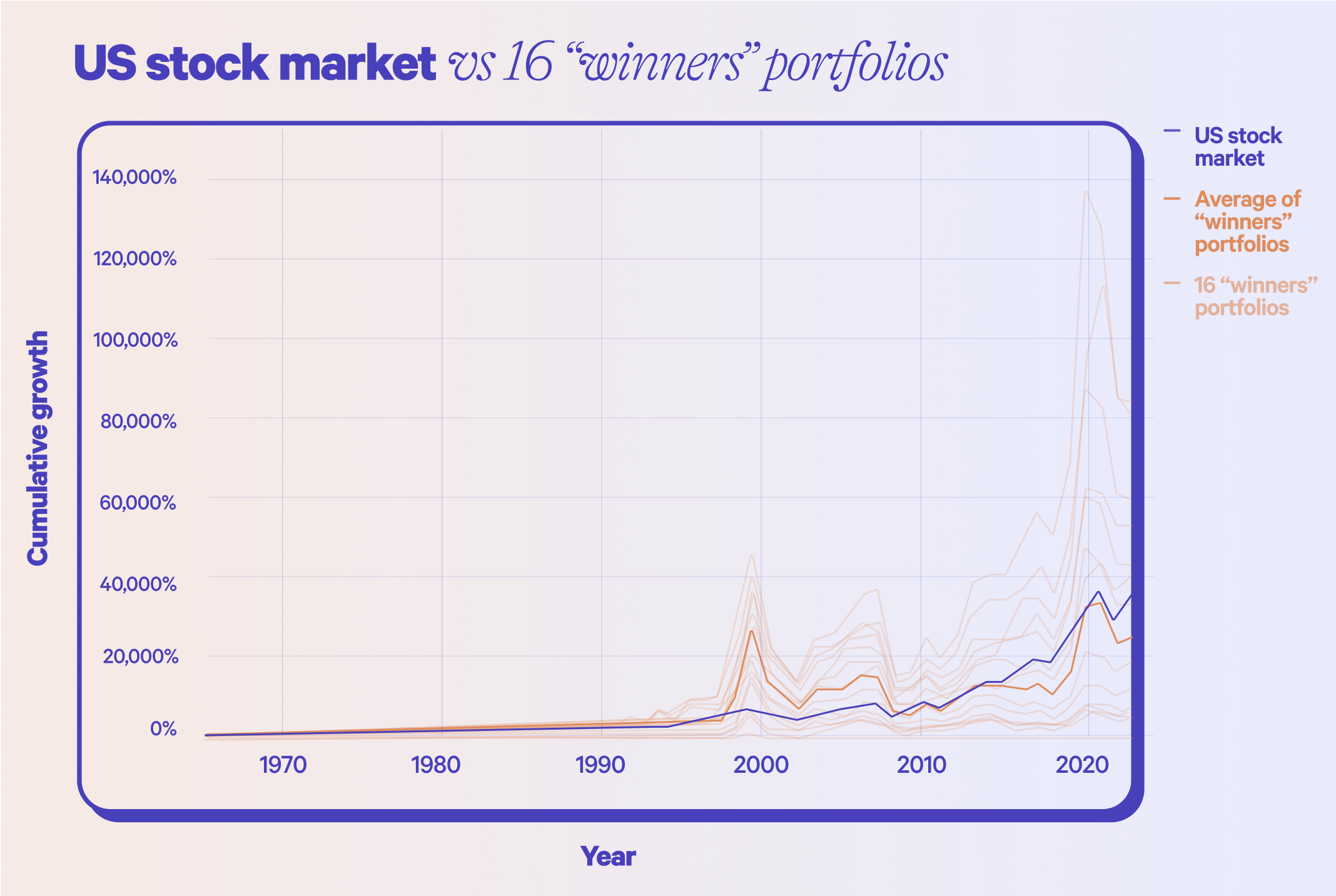 The chart below shows the cumulative return of the average of all 16 “winner” portfolios, along with the cumulative return of the US stock market. On average, the “winners” portfolios we studied performed worse, for the most part, than the total US stock market over the analysis period. This is true even though we excluded companies that would have gone bankrupt or stopped trading during the current year from the “winners” portfolios (we did this to avoid situations where we did not have a full year of data).