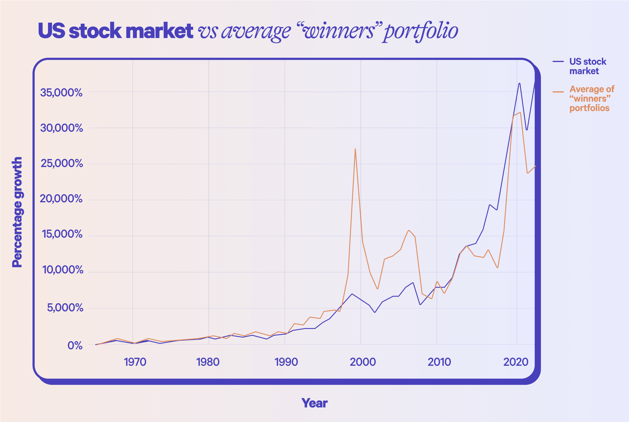 It’s worth noting that during the internet bubble of the late 1990s, the average “winners” portfolio did beat the US stock market handily. This is largely because tech stocks that performed well in 1998 (including Amazon, AOL, Yahoo, Dell, Best Buy, and Apple) also performed well in 1999. The average “winners” portfolio beat the US stock market for much of the 2000s, too. But over the whole period included in our analysis, the average “winners” portfolio return was 9.64%—0.73% lower than the 10.37% US stock market return.