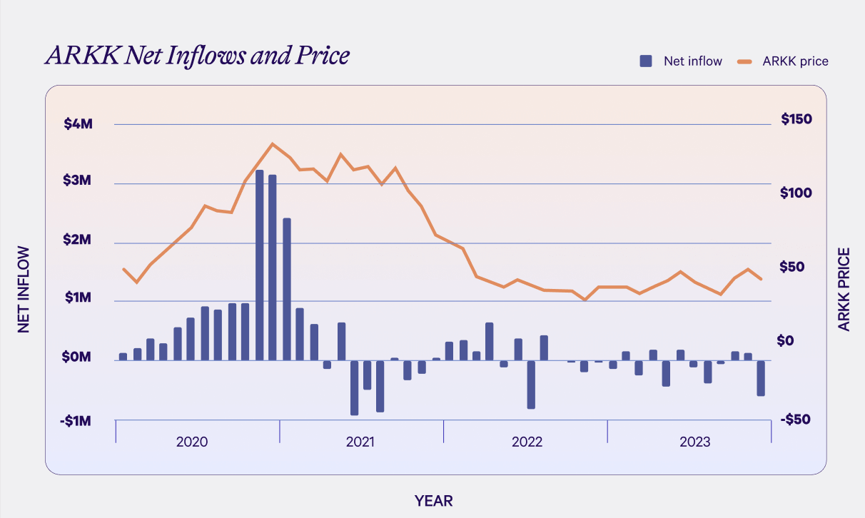 The chart below illustrates this phenomenon by plotting the price of ARKK against the fund’s inflows and outflows over time. (ARKK has paid $1.14 in dividends since January 2021, but this is insignificant compared to the price decrease since then.)
