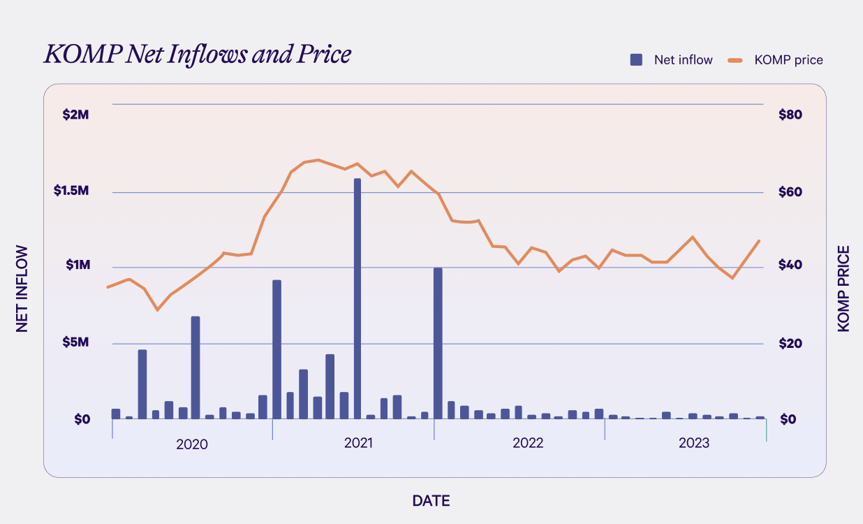 This behavior is not specific to ARKK. The same pattern can be seen when looking at inflows and returns in other tech sector ETFs over time, like the SPDR S&P Kensho New Economies Composite ETF (known as KOMP). KOMP seeks to track innovative technology companies, with a focus on those using artificial intelligence, automation, and robotics. For most of the time from its inception in late 2018 leading up to 2021, a share of KOMP cost under $40. However, as the chart below shows, KOMP’s price shot up to $67 in early 2021 and net inflows peaked in mid 2021, when the price of a share of the fund was over $65. Currently, the price is back to about $45 and net inflows are very small. If you bought KOMP near the peak, as many people did, your investment is worth much less today. From the end of June 2021, when inflows peaked, to the end of June 2024, the price of a share of KOMP has declined 31%.