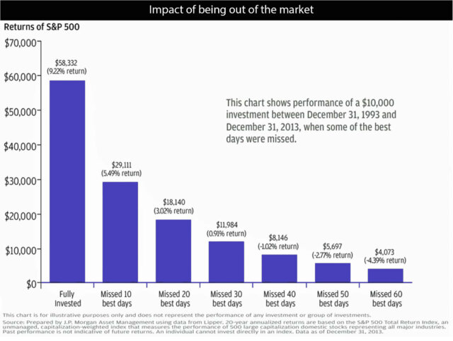 To reinforce this idea, let’s look at some extreme-but-illustrative examples of how much it could have cost an investor to miss some key days of surging prices. In the table below, JP Morgan Asset Management evaluated the performance of the S&P 500 over 20 years from December 31, 1993 to December 31, 2013 which represents more than 5,000 days during which the markets were open. If you stayed invested the entire time, a $10,000 investment would have multiplied to $58,332 – a 9.2% annual return.