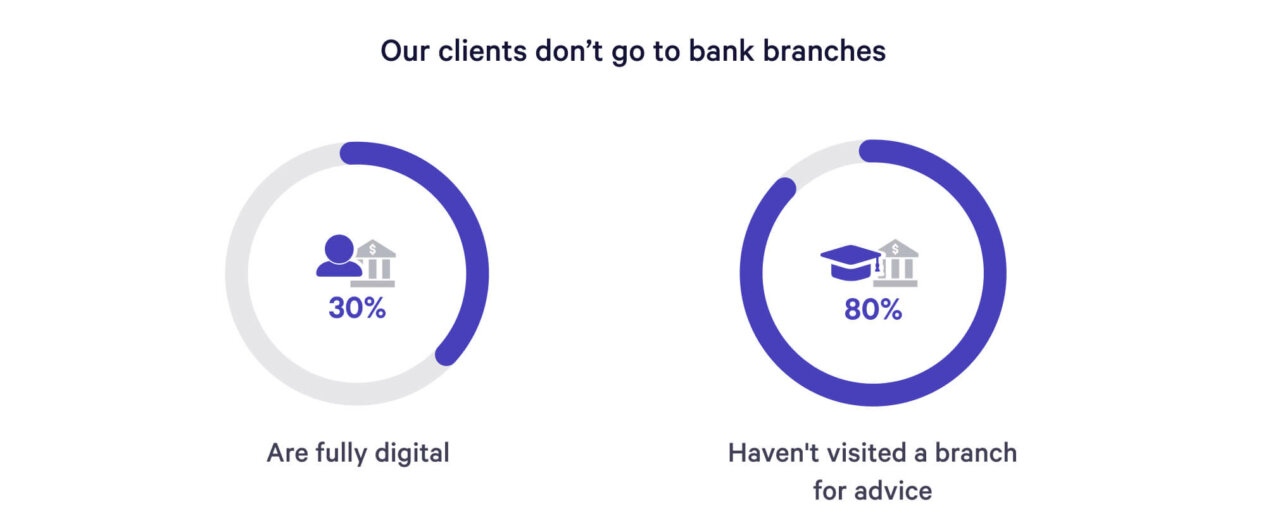 We saw this absurdity start to take hold in 2016 when CapitalOne refashioned several branches into cafés offering coffee and snacks. Despite these efforts, when we survey our clients under the age of 40, we see a clear behavioral trend that does not map to these modernization and expansion efforts. There is a growing trend of what we call “branch-nevers” emerging among people under 40 in the U.S. In fact, 30% of our clients are fully digital, meaning they haven’t visited a bank branch in the last year, or ever. 80% of our clients haven’t ever visited a bank branch for any type of advice or education.