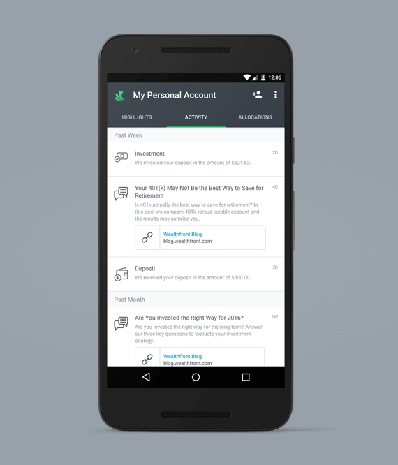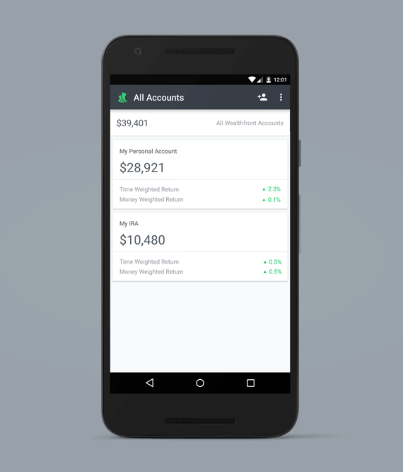 Wealthfront for Android gives you a clear view of all your Wealthfront accounts in one place including your taxable accounts, IRAs, and rolled-over 401(k) accounts from old employers.