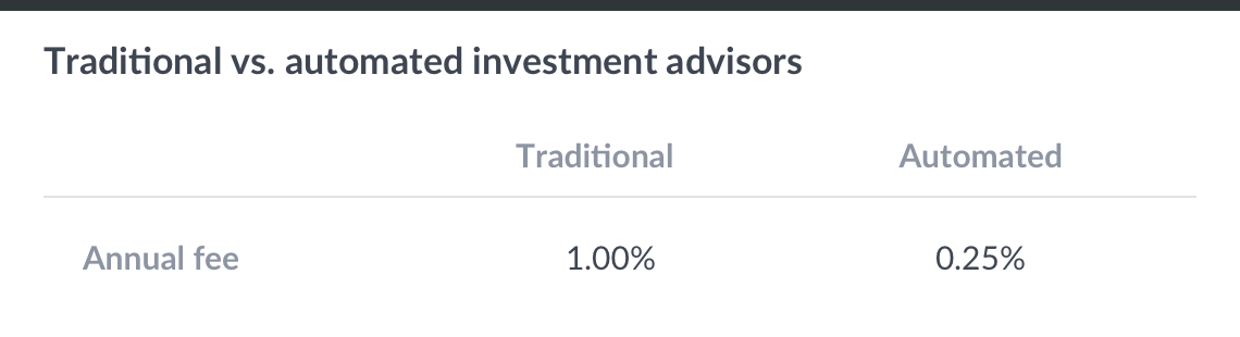 To illustrate the effect of fees, we’ll consider the investment outcomes of an investor choosing between a traditional and an automated financial advisor. The two advisors use active and passive (i.e. index) funds, respectively, and charge different annual advisory fees based on their different approaches to spending face-to-face time with their clients. We’ll further assume that the pre-fee returns of the average actively managed fund and that of the lowest cost passive fund are indistinguishable based on research done by our Chief Investment Officer, Burt Malkiel.1