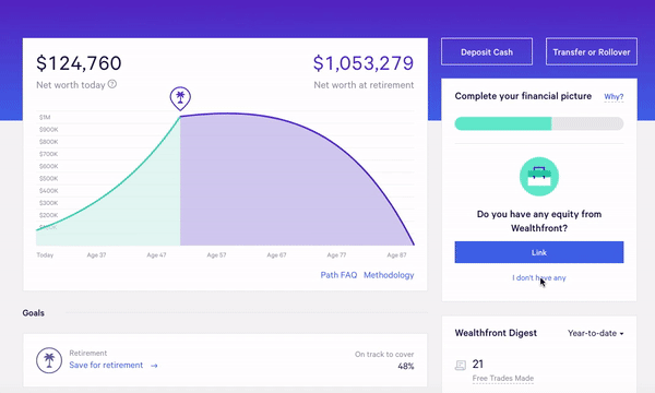 For each account type you link, our advice engine, Path, does some automatic number crunching to project how your future net worth might look and what you might need to spend in retirement. In the near future, we will help you create multiple goals and understand the tradeoffs between each goal type. All of this done with software, in just a few minutes.