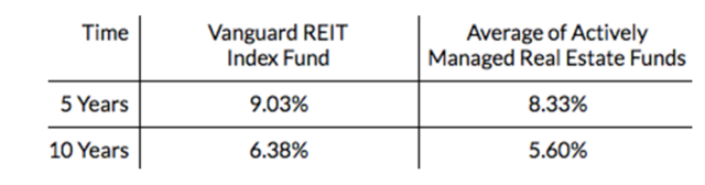 Let’s be clear: just like with professional investment managers, professional real estate investors have a hard time outperforming their relevant indexes. In the table below we compare the average of actively managed real estate focused mutual funds (reviewed by Lipper, one of the most respected mutual fund industry analytics companies), with the relevant real estate index fund offered by Vanguard (VNQ) over the past 5 and 10 years. As you can see the Vanguard index fund outperformed the average for actively managed real estate funds by a significant amount over long periods of time.