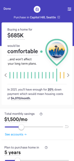 Given that so much of what we do at Wealthfront is centered around helping you prepare, save, and invest for the future you want and make the smartest possible moves around big expenses, and we’re particularly driven to give our clients the info and support they need to plan for buying a home. When you want to look at different home-buying scenarios — How does your budget change if you move jobs or cities? How much of a down payment is ideal for your situation? What trade-offs can you make to your overall financial plan to make buying a home possible and keep it from holding you back with other plans? — we extremely have your back.