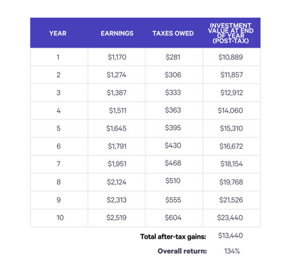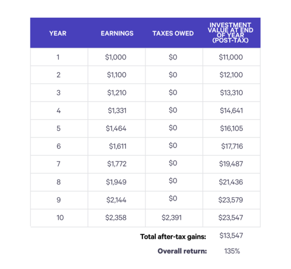 In this first example, we’ll assume you invest $10,000 in an index fund that tracks the market and you hold that investment for 10 years. To keep the math simple, we’ll assume you earned an annual return of 10%. At the end of the 10 years, we’ll assume you owe the average 15% capital gains tax on your gain. As the table below shows, your overall after-tax return would be 135%.