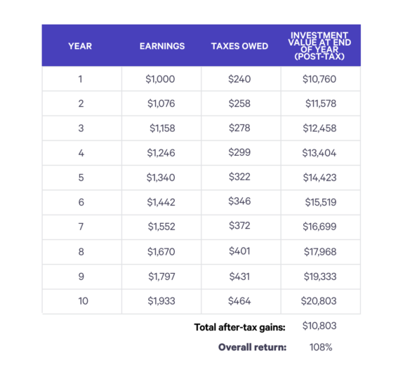 Tax rates and compounding interest can feel complicated and abstract, so let’s look at some concrete examples that demonstrate how this works. Below, we’ve outlined three scenarios. In each case, we look at a hypothetical investment of $10,000, investigating how it grows and is impacted by taxes over 10 years. To simplify all three examples, we’ll ignore the impact of fees. We’ll also assume you don’t make any additional deposits or withdrawals except for tax purposes.
