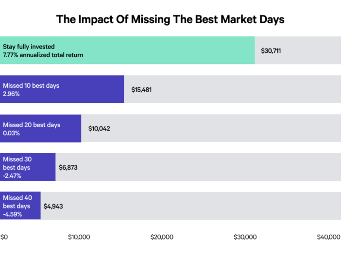 If you missed the 40 best days (roughly 1% of the 15-year time period), your 7.7% average annual gain would have converted into a loss of $5,057. The takeaway? Patience and staying invested for the long term are crucial for the greatest long-term benefit.