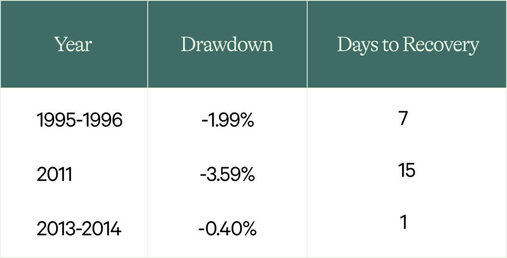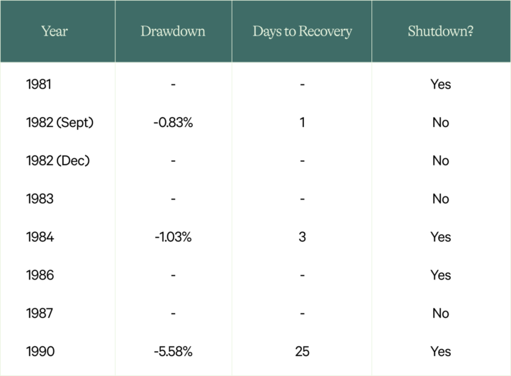 Maximum drawdown and time to recovery during previous government shutdowns:
