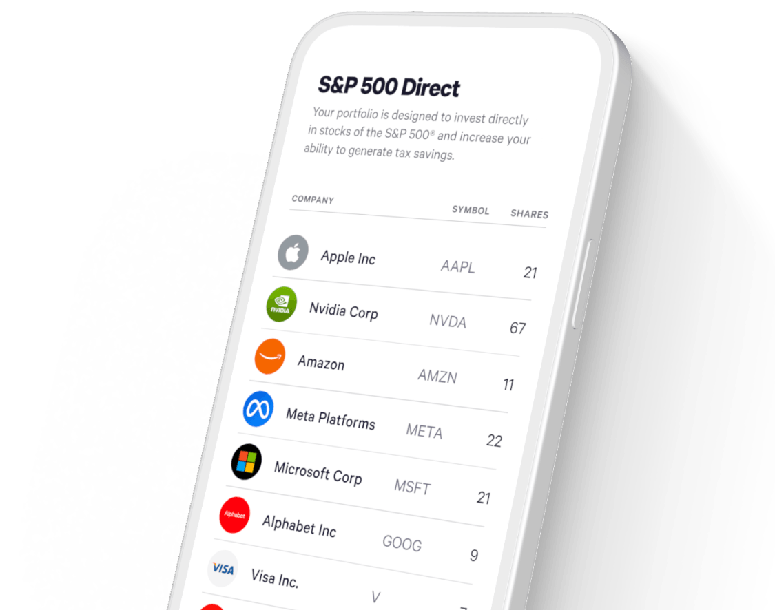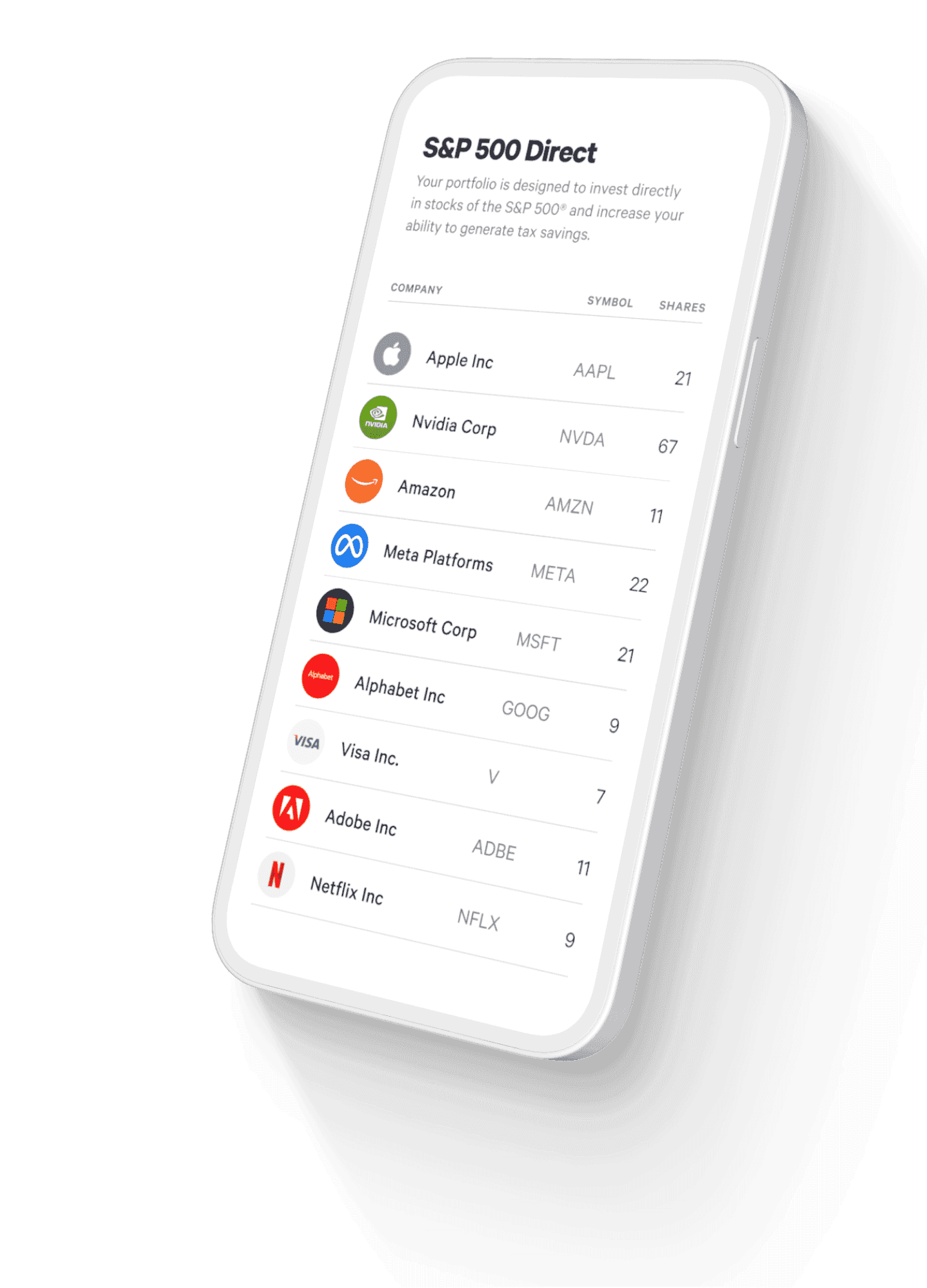 With S&P 500 Direct, you’ll own individual stocks (including whole and fractional shares) that make up the S&P 500® index—some of the largest companies driving the US economy. By owning hundreds of stocks—instead of a single ETF—we’ll help find more opportunities to collect tax savings and lower your tax bill.